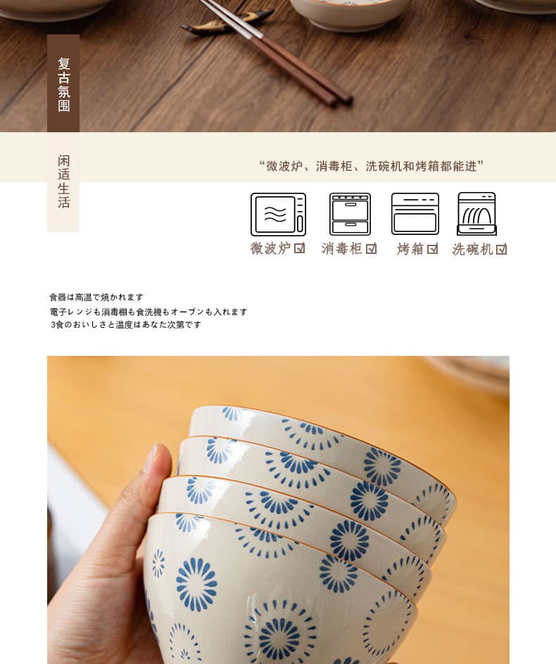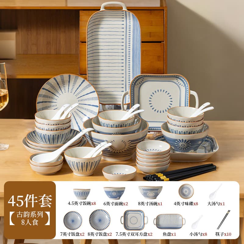 High-end antique-style tableware set, including soup bowls, rice bowls, simple ceramic bowls, and underglaze painted bowls and plates.
