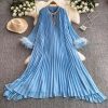 Korean Chic Autum New French Retro Diamond-Encrusted Round Neck Loose Long Bell-Sleeved Pleated Dress for Women