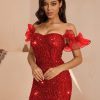 Red European and American Women’s One-Shoulder Dress Party Sexy Sequin Ruffle Hip-Covering Slim Short Skirt Dress Nightclub
