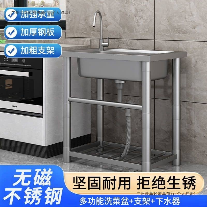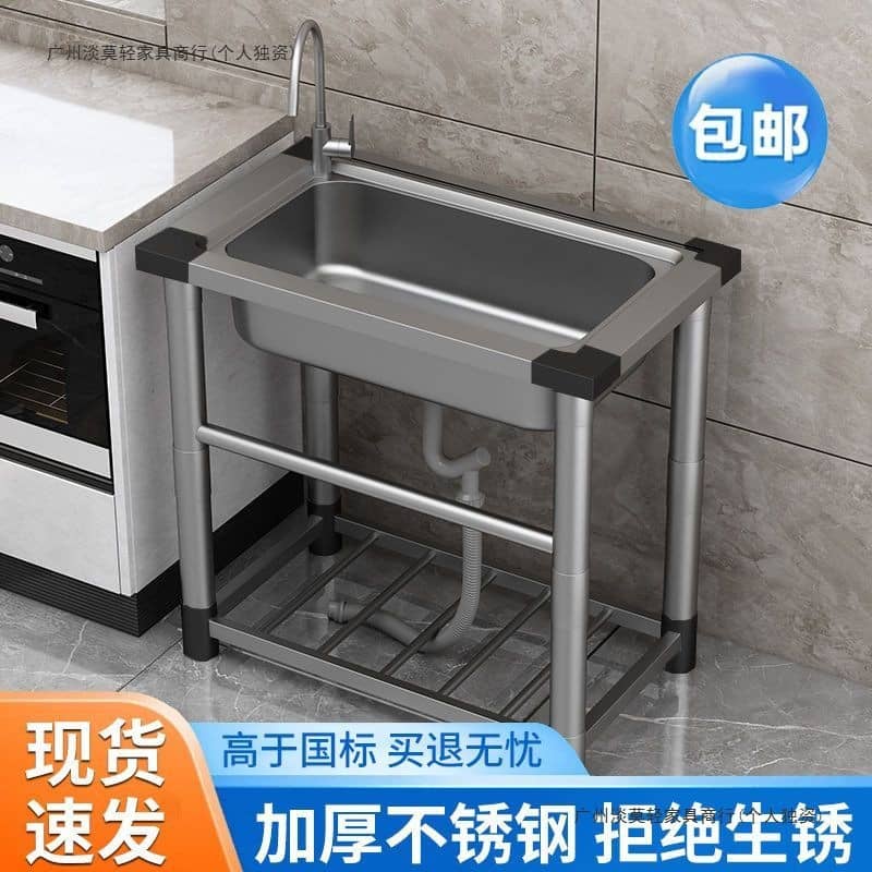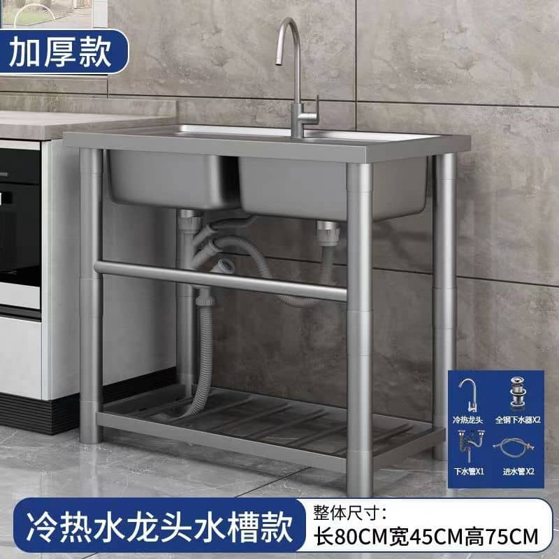 Thickened stainless steel kitchen sink with support, single basin, construction site handwashing basin, commercial dishwashing sink. Thickened double-sink design, 80cm long, 45cm wide, 75cm high, equipped with hot and cold water taps.